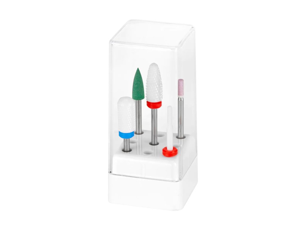Součástí balení je sada 5 fréz různých tvarů a zrnitostí – keramických i pískovcových, vhodných pro profesionály i začátečníky.