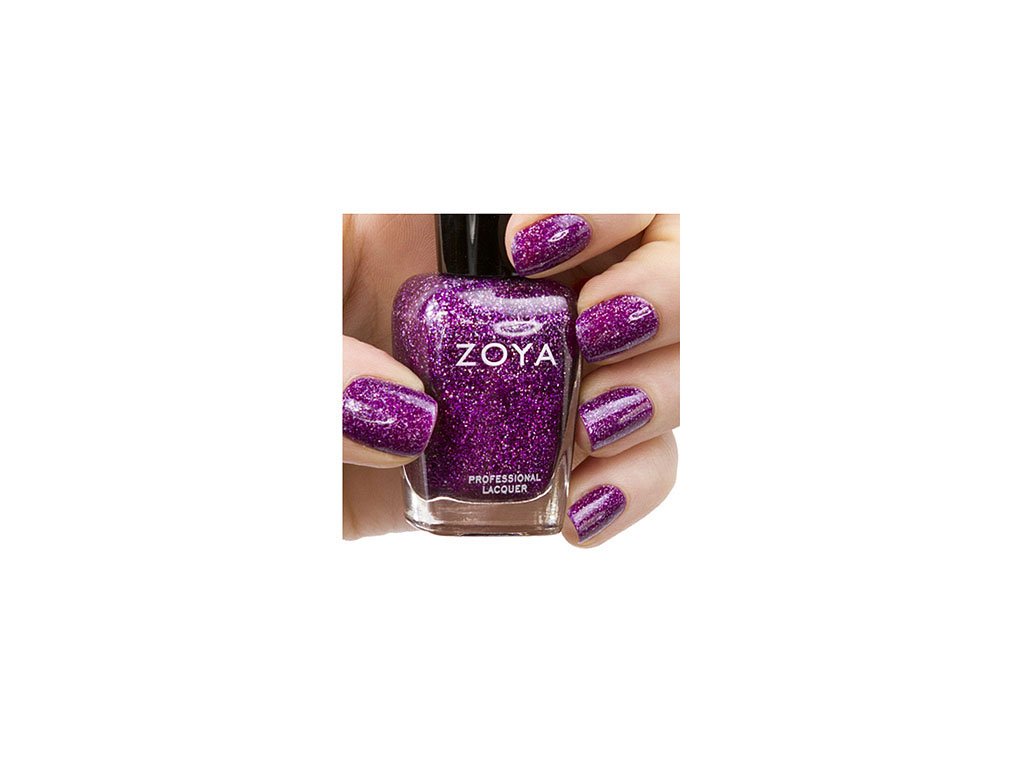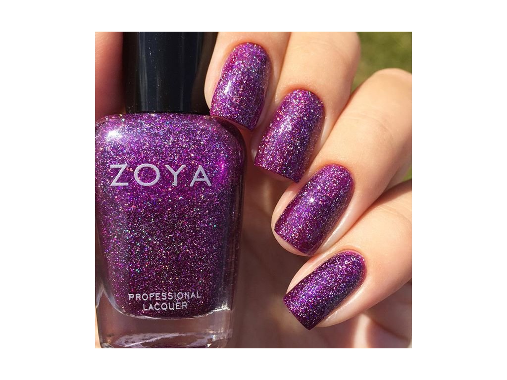 Aurora značky Zoya lze nejlépe charakterizovat jako plně krytou, středně fialovou barvu jako "švestka v cukru" s vysokou koncetrací mikro diamantového, holografického třpytu. Tento duhový, holografický odstín plný jisker mění švestkovou fialovou na něco skutečně důstojného.