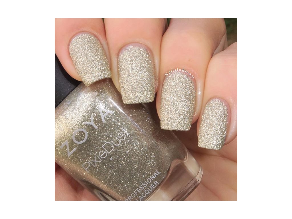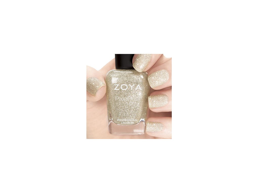Tomoko značky Zoya lze nejlépe charakterizovat jako třpytivou romantickou stříbrnou/šampaň s exkluzivní Zoya PixieDust matnou třpytivou metalickou texturou.