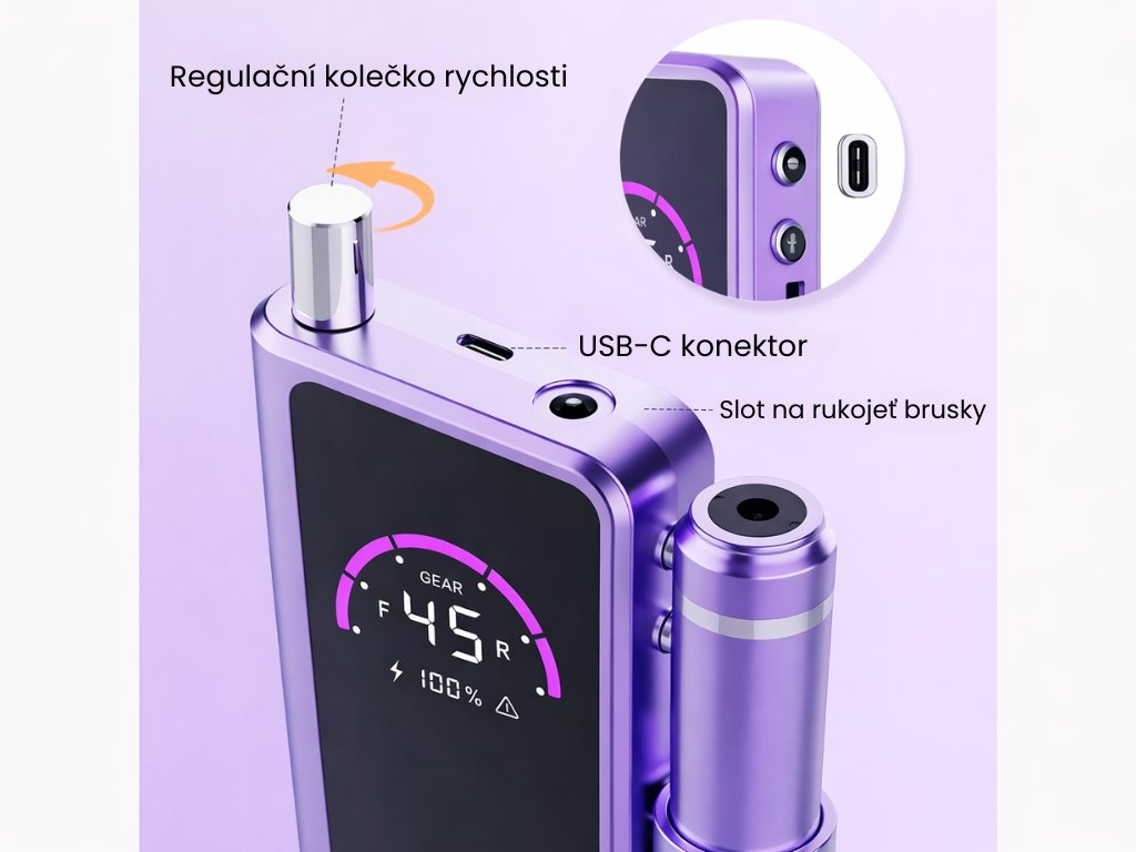 Elegantní, výkonná a maximálně praktická. Bezdrátová bruska na nehty MX-S3 v jemném metalickém fialovém odstínu je ideální volbou pro profesionální nehtová studia i náročné domácí použití. Spojuje moderní design, vysoký výkon a komfortní ovládání v jednom kompaktním zařízení.
