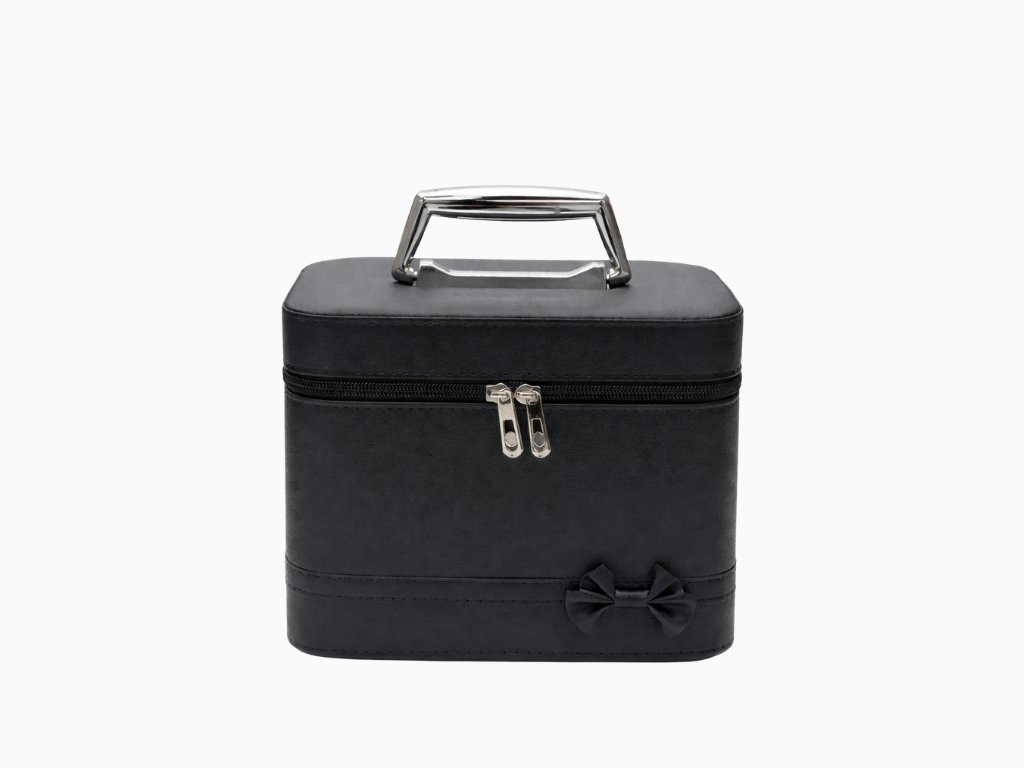Elegantní kosmetický kufřík v nadčasové černé barvě s kontrastním růžovým interiérem je ideální volbou pro přehledné uložení kosmetiky doma i na cestách.